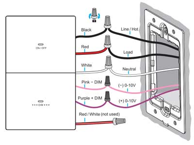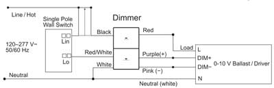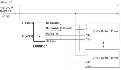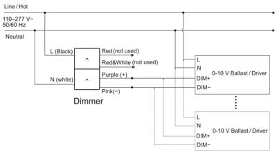1 Channel 0-10V Wall Switch for Dimming Control Input voltage is 100-277VAC universal voltage design suitable for installation and use in North America, 0 10V dimming design Rain Net dimming driver to 0V minimum brightness, when the voltage is 10V the device will operate at 100% state