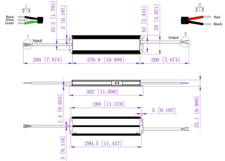 2. Output cable 12AWG(12V), 14AWG(24V/36V/48V), Red cable (+) to Positive side(+), Black cable (-) to Negative side (-).
