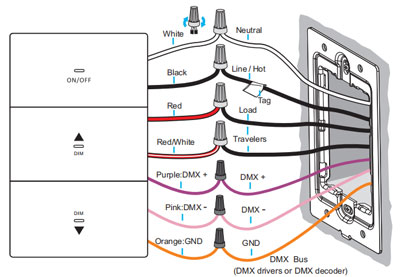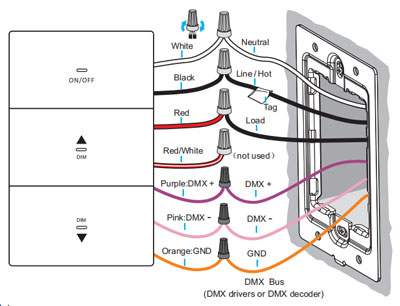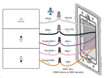 New upgraded DMX wall dimmer with DMX output signal. This three-button white plastic housing dimmer operates like any standard household light switch. It operates independently and does not require address setting. It is ready for use after installation.