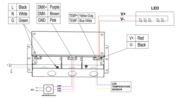 Dimming wire | Purple(DMX+) Brown(DMX-) Pink(GND)(3*18AWG) |