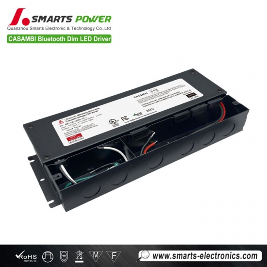100-277VAC universal input voltage range, Bluetooth CASAMBI wireless dimmable LED power supply with integrated junction box design, offering simple and convenient wiring and 1-5 channels to choose from. Features PWM output mode for smooth and stable, flicker-free dimming.