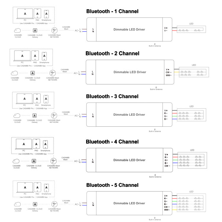 | Output wire | 1 Channel:DW | 2 Channel:CCT | 3 Channel:RGB | 4 Channel:RGBW | 5 Channel:RGBCW |