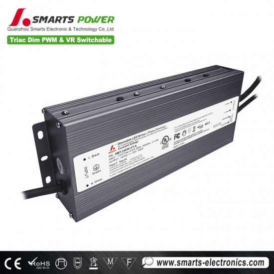 This triac dimmable constant voltage 600W led power supply has switchable dimming modes of PWM and VR mode. The dimming range is between 0-100% for smooth flicker-free dimming. It has ultra-low load requirements and can work perfectly at 15%-100% load.