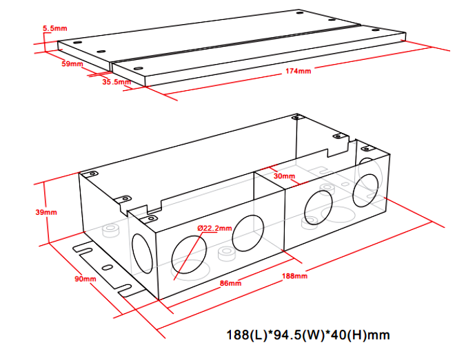 1.0 version: 188*92*26mm(L*W*H); 2.0 version: 188*94.5*40mm(L*W*H)