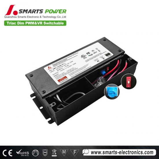 Smartspower new upgraded triac dimmable led power supply 100W 12V has built-in rocker switch to switch between voltage drop output and pwm output. Dimming range is 0~100%. Complies with global safety lighting regulations. 7-year warranty