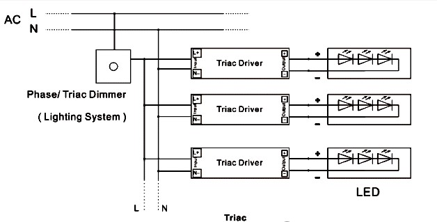 Ø The Pulse-Width Modulation (PWM) of output voltage can be adjusted through input terminal of the AC phase line(L) by connection a phase /Triac dimmer of lighting system.